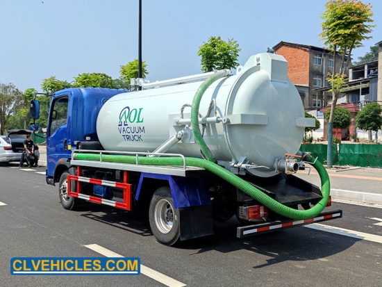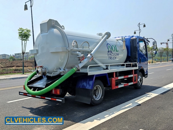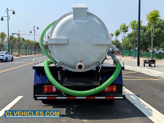 2. Вакуумная машина оснащена смотровым окном уровня и самотечным патрубком, устройством для мытья рук, противопереливным клапаном, всасывающим трубопроводом длиной 8 метров, гидравлическим открыванием задней двери и вакуумным насосом SK-15 для циркуляции воды. Вакуумная машина имеет большой ход всасывания и большую мощность всасывания. Кроме того, цистерна имеет функцию подъёма.